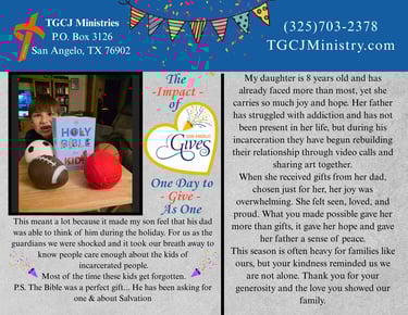 Through God Comes Justice is a social welfare organization that provides faith-based programs and resources to inmates and their families in Tom Green County. Our goal is to help strengthen relationships and build a stronger community through faith and family-focused programs.