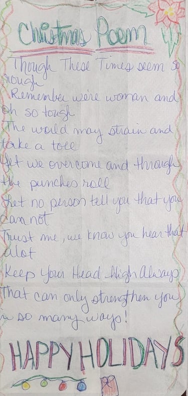 "Thank you guys for the wonderful Word, fun, and yummy eats, y'all brought to the Christmas Party in the women's facility of Concho Valley. I was blessed..."